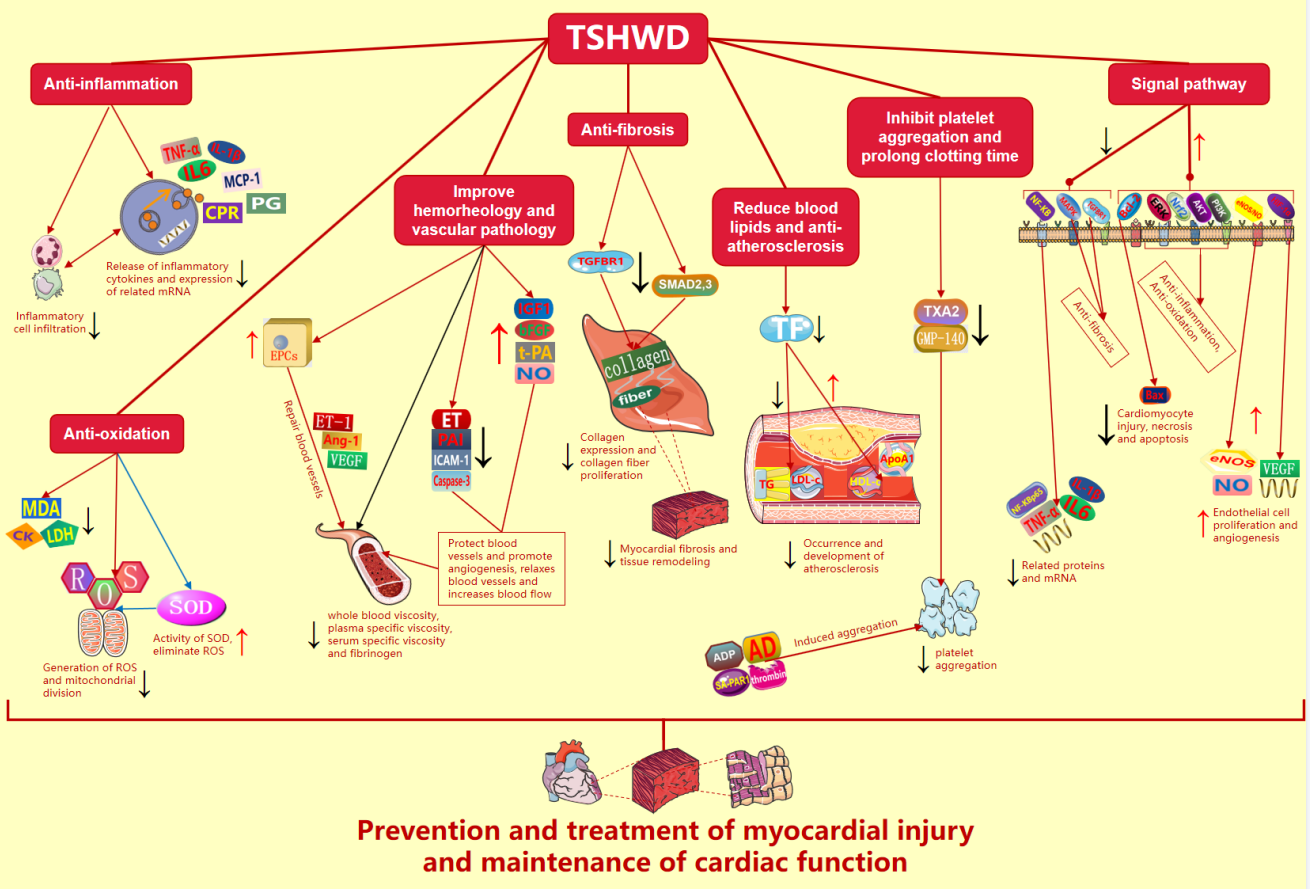 近年来,随着科研人员在基础与临床方面对桃红四物汤不断深入的挖掘与研究,发现了其在心血管疾病的预防与治疗上有了更多的进展。目前的机制研究表明,其可能是通过抑制炎症反应,抗氧化应激,抑制血小板聚集、延长凝血时间,抗纤维化,降血脂、抗动脉粥样硬化,改善血液流变学及血管病变,调控相关信号通路等机制预防和治疗心肌损伤,从而发挥保护心肌细胞、改善心功能的作用(图2)。