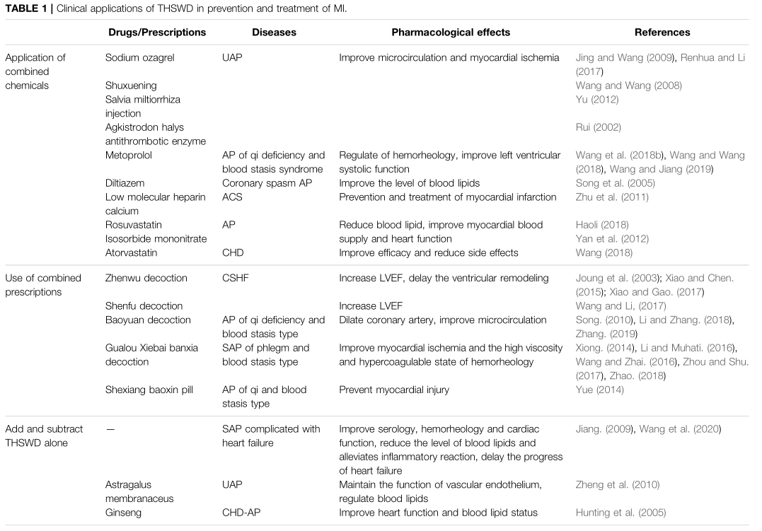 许多的临床研究文献显示,桃红四物汤在防治冠心病心绞痛和心肌梗死心肌损伤相关的心血管疾病中存在实用性且有一定的疗效,其在临床上多以加减方、组合复方以及联合化学药品等方式来使用(表1)。