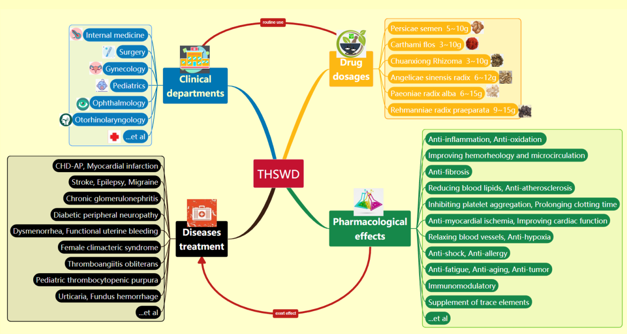 近年来,随着学者们在基础与临床方面对桃红四物汤(THSWD)不断深入的研究与发现,桃红四物汤从最初作为一个妇科调经基础方之一,随后逐渐扩展了其现代临床治疗的范围(图1)。