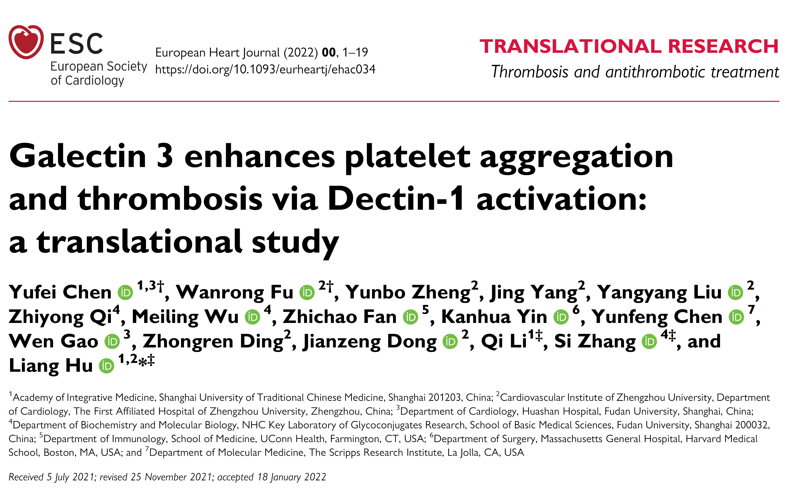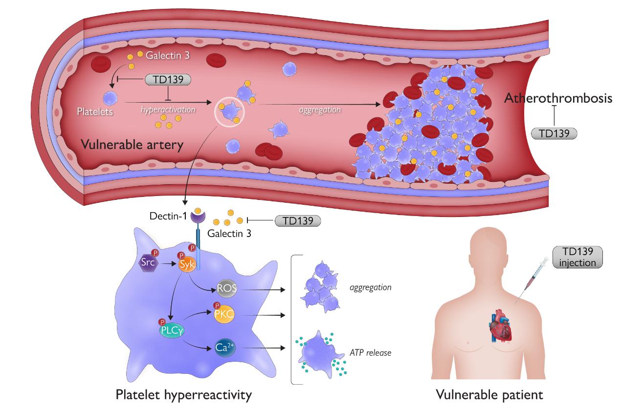 近日,欧洲心脏协会会刊European Heart Journal(IF=29.983)以Research Article在线发表了91制片厂 中西医结合研究院胡亮团队最新研究成果-“Galectin 3 enhances platelet aggregation and thrombosis via Dectin-1 activation: a translational study”,首次提出: (1)Galectin-3结合血小板膜表面的C型凝集素Dectin-1受体,促进血小板聚集和血栓形成。(2)TD139作为一种II期临床试验中应用的Galectin-3抑制剂,能抑制Galectin-3介导的血小板活化和血栓形成,且不加剧出血风险。(3)靶向Galectin-3可能作为心血管疾病治疗的新策略。针对Galectin 3/Dectin-1信号通路,研究团队发现柑橘果胶和β-葡聚糖等多个具有优秀的抗血小板作用的天然活性产物。