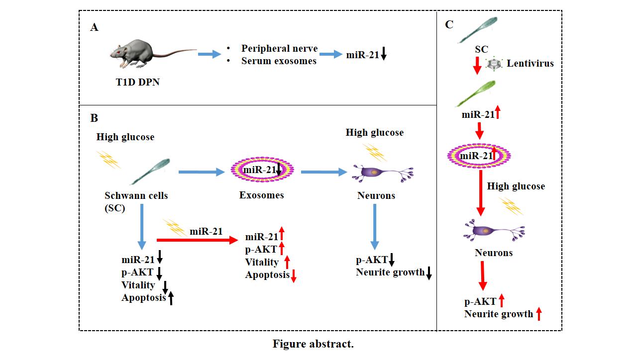 DPN是糖尿病的常见并发症,不仅严重影响患者的生活质量,也与患者生存预后相关。目前,DPN的发病机制虽尚未完全阐明,但高血糖普遍被认为是DPN的重要致病因素,因此寻找高糖环境下参与调节神经生长的分子将对DPN的治疗和预防具有重大的科学意义和实践价值。该研究体内实验首先发现,DPN大鼠血清外泌体中的miR-21下降;在体外模拟高糖环境下,雪旺细胞(Schwan cell, SC)的增殖抑制、凋亡增加,SC及其外泌体中的miR-21下调,而过表达miR-21则逆转了这些变化;当与高糖培养的SC来源的外泌体共培养时,神经元突生长被抑制,相反,当与过表达miR-21的SC来源的外泌体共培养时,神经突生长加速。此外,该研究进一步表明,SC来源的外泌体miR-21可能通过影响AKT信号通路参与了以上过程。综上,该研究不仅发现了参与调节DPN的潜在分子机制,也为DPN的防治开辟了新的视角。