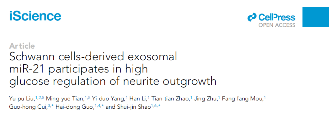 近日,我校中西医结合研究院国海东研究员和基础医学院邵水金教授团队在探索参与影响糖尿病周围神经病变(Diabetic peripheral neuropathy, DPN)的调节分子及潜在作用机制方面取得新的进展,该研究成果Schwann cells-derived exosomal miR-21 participates in high glucose regulation of neurite outgrowth 发表在Cell子刊iScience杂志上。