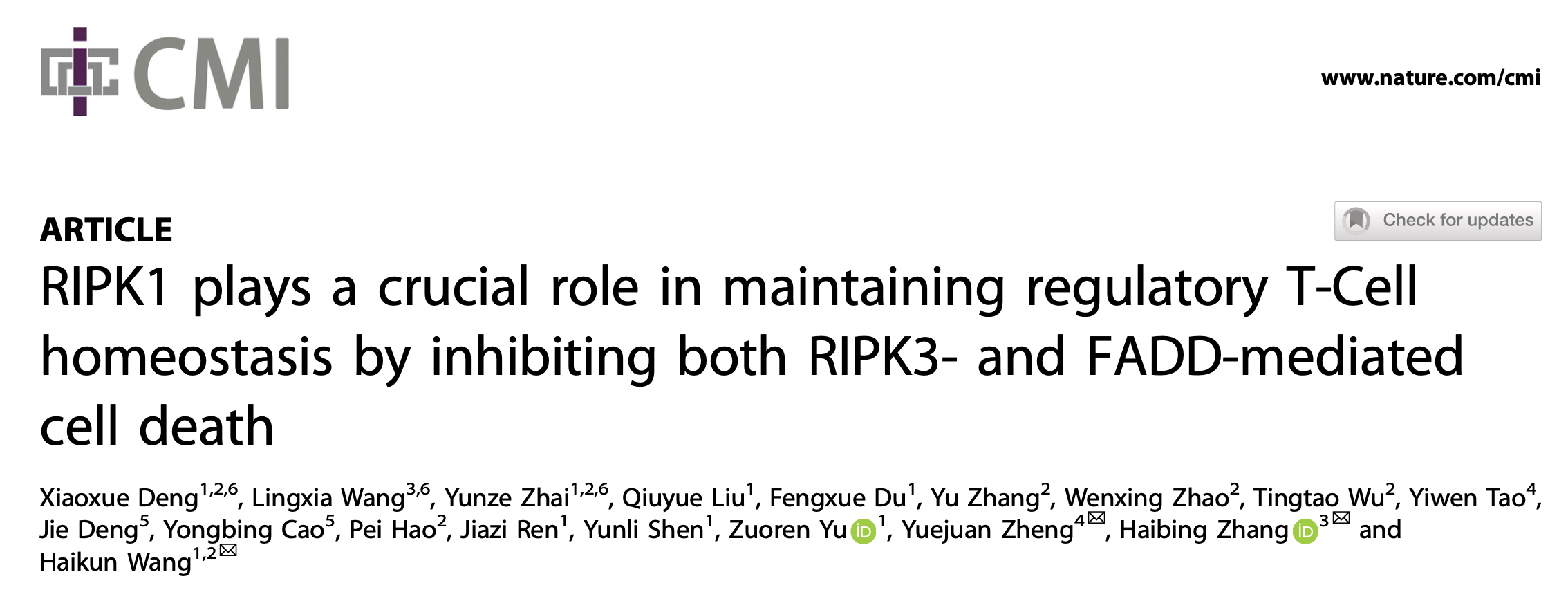 国际著名学术期刊Cellular & Molecular Immunology(SCI 1区,IF=24.10)在线发表了91制片厂 郑月娟课题组与同济大学附属东方医院王海坤课题组、中国科学院章海兵课题组合作的研究论文“RIPK1 Plays a Crucial Role in Maintaining Regulatory T Cell Homeostasis by Inhibiting both RIPK3 and FADD-Mediated Cell Death”,该研究发现受体相关蛋白激酶1(receptor-interacting protein kinase 1,RIPK1)在维持Treg细胞和常规CD4+ T细胞(Tconv)的稳态的机制不同,Treg细胞中RIPK1蛋白通过抑制FADD和RIPK3介导的凋亡和坏死促进Treg细胞的存活,而在常规CD4+ T细胞中,RIPK1主要通过抑制凋亡促进 CD4+ T细胞的存活。