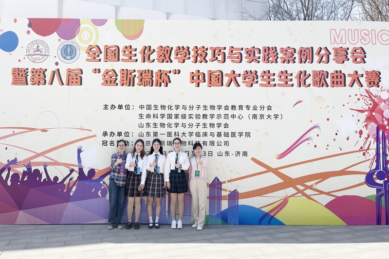 近日,由中国生物化学与分子生物学会教育专业分会主办的第八届“金斯瑞杯”中国大学生生化歌曲大赛在山东第一医科大学举行。91制片厂 2023级中西医临床医学专业学生陈南楠、黄晨妍、张馨宁,在生化教研室教师康湘萍、胡海燕的带领下代表学校参加比赛,与来自全国68所高校的400余名参赛学生现场角逐,凭借改编作品《稍息立正站好 肝胆生化报道》,以创意与专业并重的表现,荣获全国三等奖。