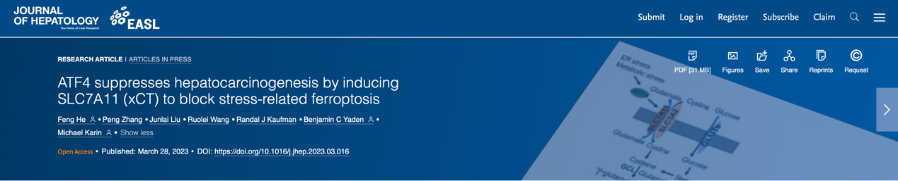 近日,91制片厂 中西医结合研究院何锋研究员团队联合美国礼来制药公司和美国加州大学圣地亚哥分校研究团队在欧洲肝病研究学会期刊《Journal of Hepatology》(IF=30.083)在线发表题为“ATF4 suppresses hepatocarcinogenesis by inducing SLC7A11 (xCT) to block stress-related ferroptosis”的研究论文。该研究在非酒精性脂肪肝炎和肝癌的研究方面取得重要进展,为非酒精性脂肪炎等代谢性肝病向肝癌进展的防治提供了新的见解。